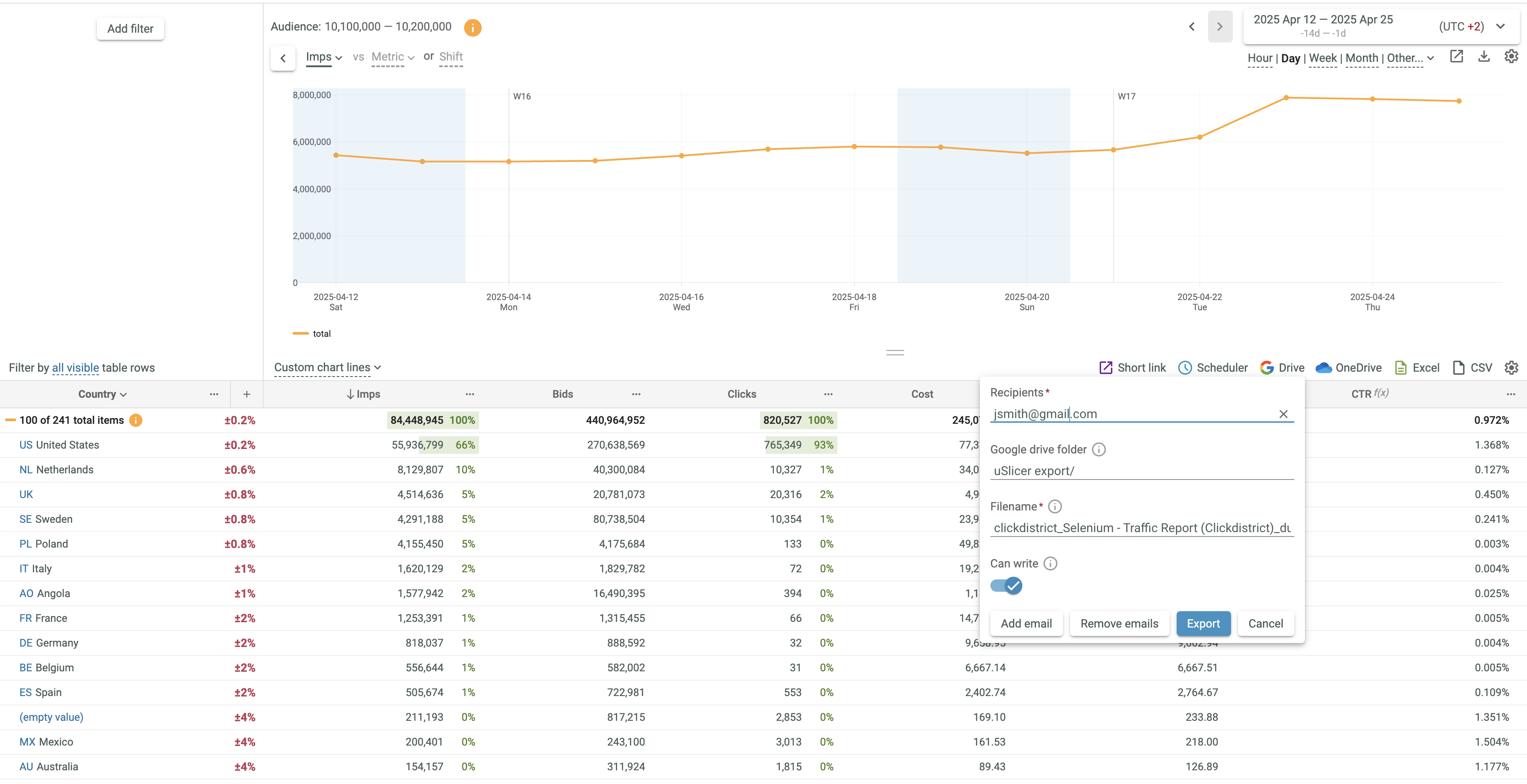 • The Report Data is exported to a new Google Sheets file, the links to this file are sent to the specified emails. Maximum 300000 matching data rows are exported.