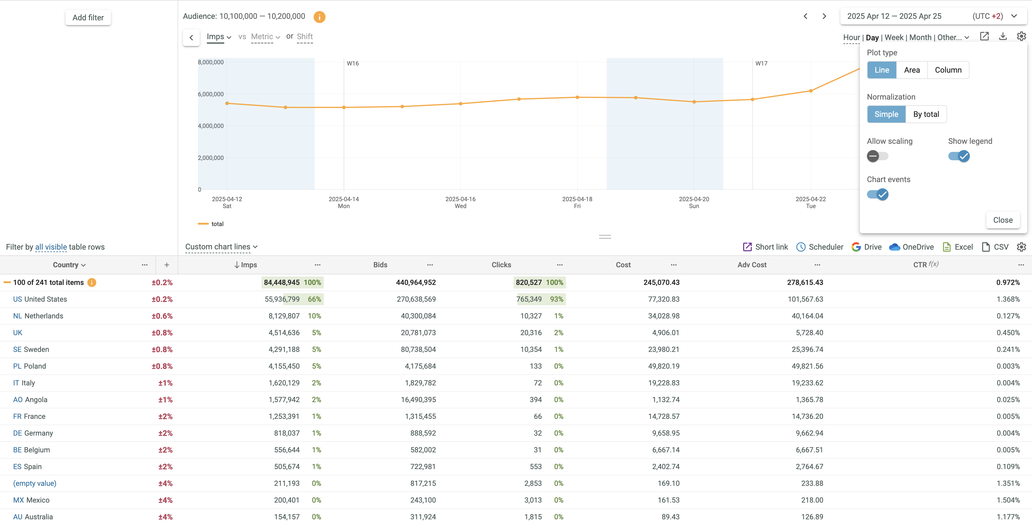 You can use plots of 3 different types: Line, Area and Column. The default type is Line.